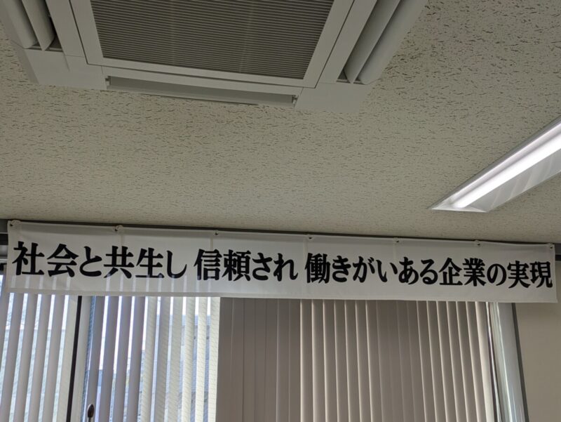 つまり横断幕の総仕上げ 私たちにとっての理想が「社会と共生し 信頼され 働きがいある企業の実現」というわけです